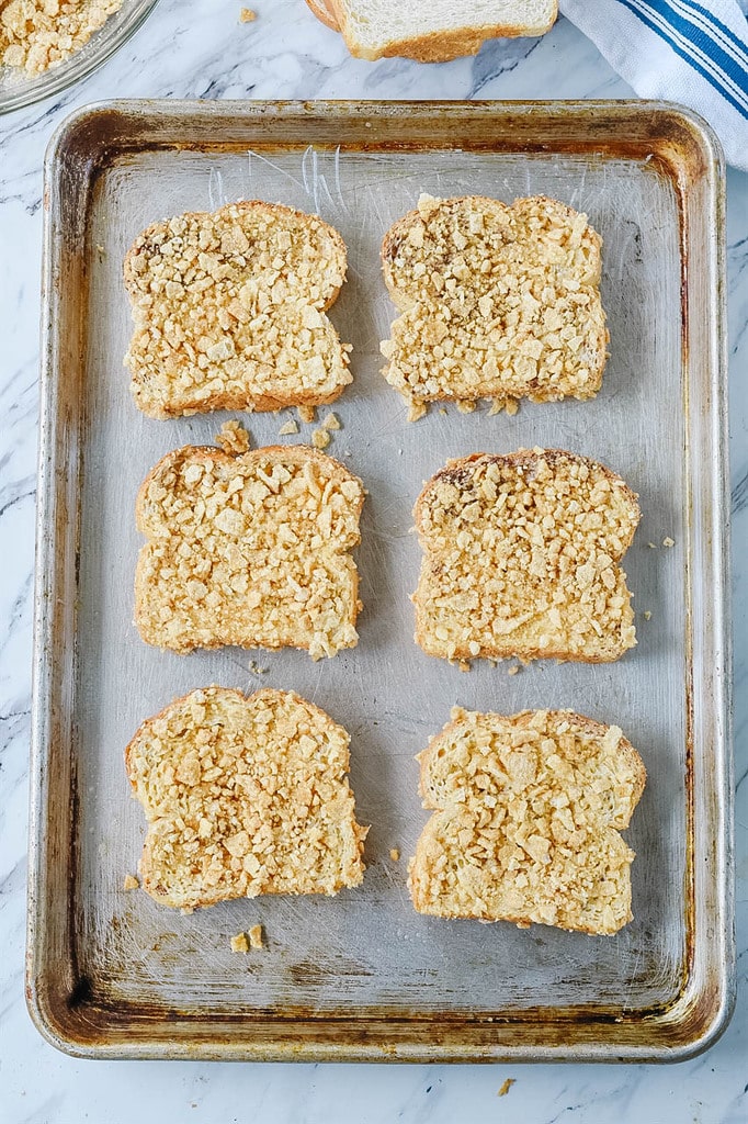 - Dip both sides of bread into crushed cereal and place on baking sheet in a single layer.