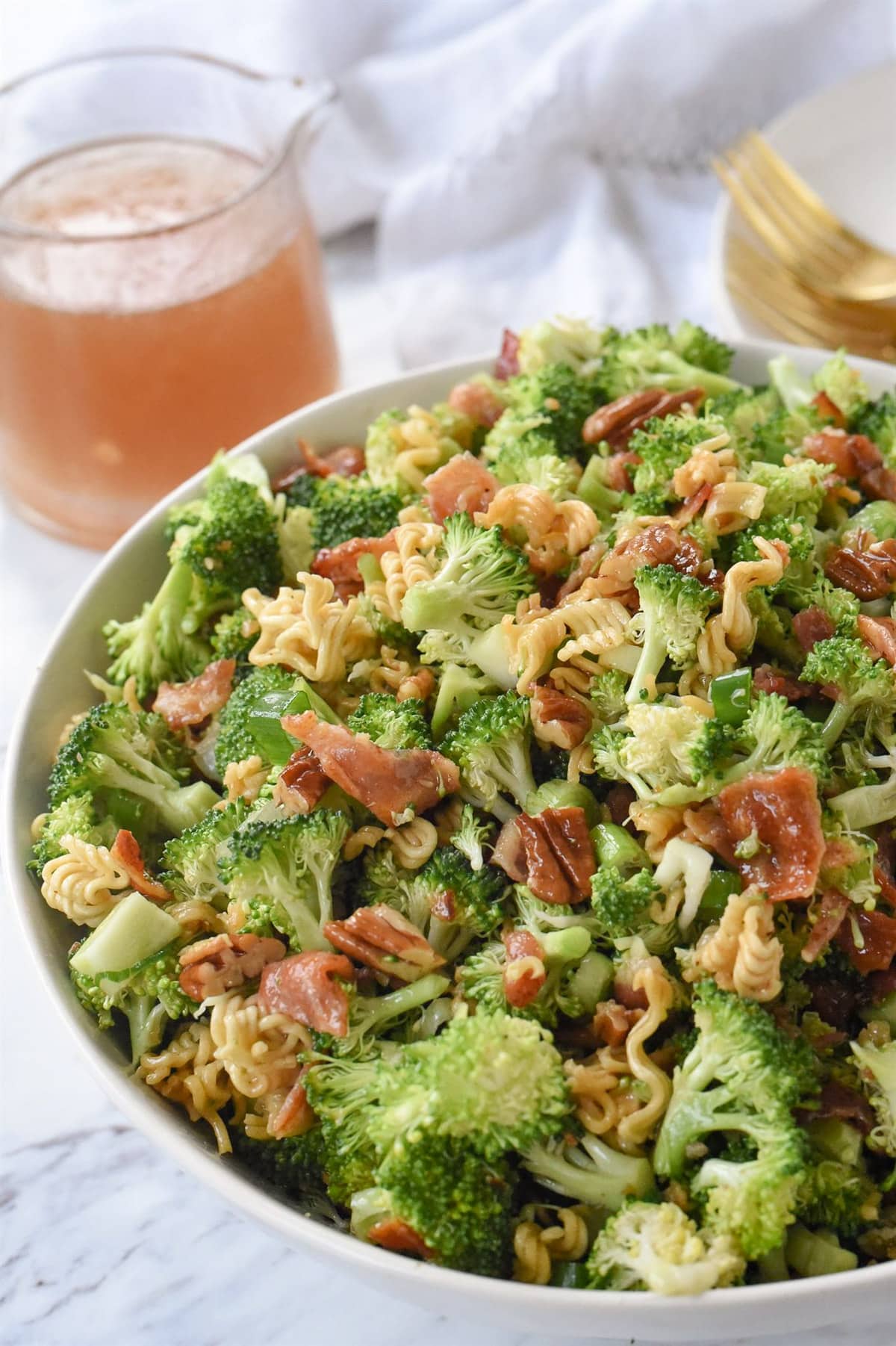 Instead of a mayo based dressing this recipe uses a light, oil and vinegar based dressing. And it is loaded with crunch. Besides the broccoli you have crunch from the toasted pecans, ramen noodles and the crispy bacon.