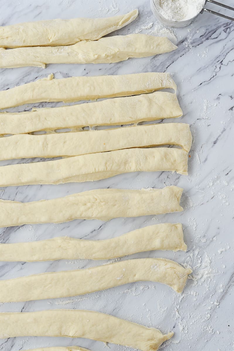- Use a knife or pizza cutter to cut the dough into about 8-10 even pieces, about 1 1/4 – 1 1/2 inches side.