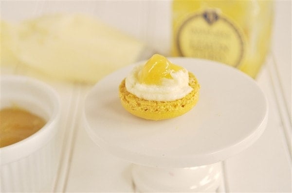 Lemon Curd Buttercream Filling: For the lemon version we used milk instead of the raspberry juice. Pipe the buttercream around the outside of the macaron and add a small spoonful of lemon curd into the middle. You can make your own lemon curd or buy store bought.