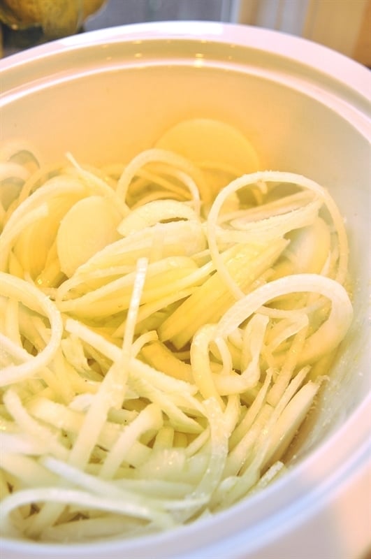 They showed us how to caramelize onions in a slow cooker. I love caramelized onions but what I don’t like is chopping onions. My husband is the official onion chopper at our house. This recipe allows you to cook a large batch at once. Then you can freeze them to use whenever you like.