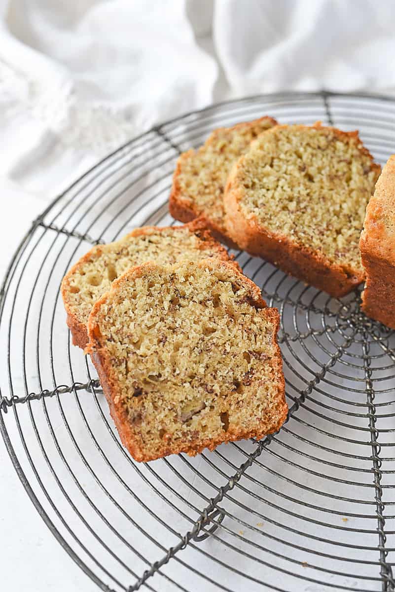 After the bread has cooled, slice and enjoy. I love my warm banana bread with a little bit of butter on it. It is perfect for breakfast or a treat anytime.
