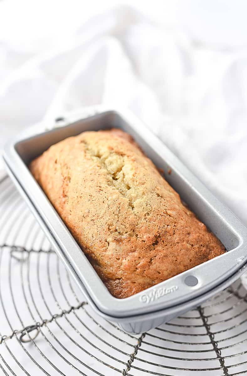 Cool the banana bread in the pan for 5 minutes. Then remove and cool completely on a wire rack.