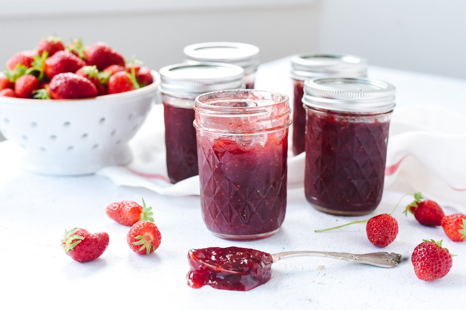 I have made homemade strawberry jam for years. In the past, I have always made freezer jam using the powdered pectin you can buy at the store. Last year when I was in France attending The Academy France we did a fun photo shoot making jam. We made a cooked strawberry jam that only uses fresh berries, sugar and lemon juice, without added pectin. This easy strawberry jam without pectin recipe is cooked on the stove top and then can be canned or frozen. It was delicious and I loved that I didn’t have purchase and add in additional pectin.