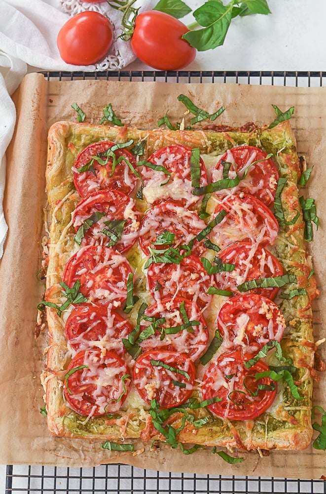 This easy tomato tart is the perfect way to use up fresh tomatoes from the garden. Made with store bought puff pastry, it comes together quickly.