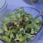 Wash and tear spinach and lettuce into pieces and combine with diced mushrooms, diced avocados, crumbled bacon, sliced grapes, and grated cheese.