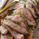 You always want to cut a roast against the grain, the trick with the tri tip is there are TWO different directions of grain in each roast due to the triangular shape. Cutting against the grain makes the meat much more tender. The grain is the way the muscle fibers run.After cooking, cut the tri tip join down the center, this is where the direction of the grain changes. Then slice each section going against its grain.